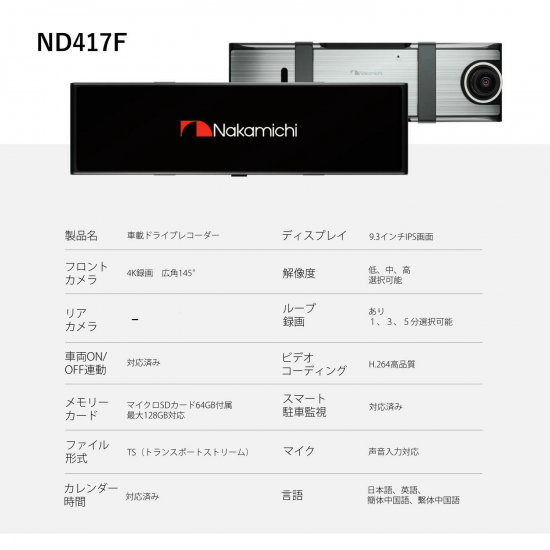【新発売】Nakamichi ミラー型 前方カメラ ドラレコ ナカミチ ドライブレコーダー ND417F